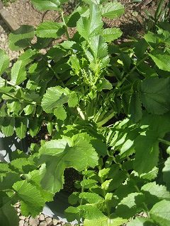 大根もそのままにしていたら、葉の間から蕾が出てきてしまいました。日中は暖かくなってきているので、とう立ちが起きています。そのままにしていると蕾の方に栄養がいってしまい、大根が美味しくなくなってしまいます。